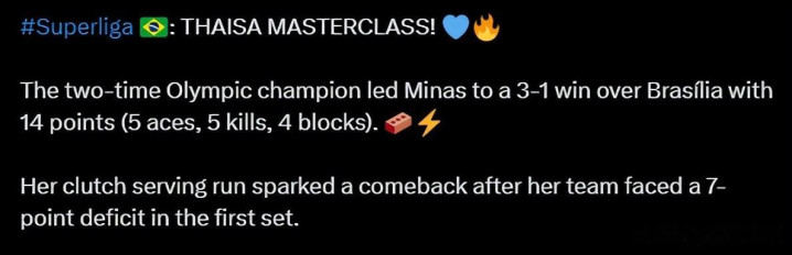 赛后统计显示,塔伊萨全场贡献14分,5记发球直接得分,5次进攻得分,4次拦网得分。国际排联赛后发文盛赞:“塔伊萨大师级表现!这位两届奥运冠军带领米纳斯队以3-1战胜巴西利亚队,她个人独得14分,在首局一度落后6分的情况下,她关键时刻的发球帮助球队扭转了局面。”